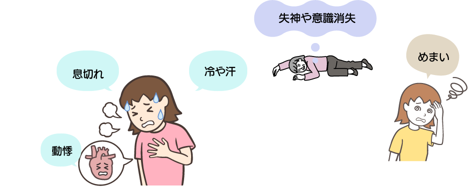 代表益な症状に、動悸、冷や汗、めまい、息切れ、失神や意識消失などがあります。不整脈には様子をみていてよいタイプ、すぐに治療が必要なタイプ、将来的に起こる問題に対し予防が必要なタイプなどがあり、危険なタイプとしては脳への血流が途絶えて脳梗塞へ至ってしまうものがあります。不整脈と脳梗塞は一見何の関連もないように思われがちですが、実は大変密接な関連があります。不整脈の中でも特に心房細動が要注意です。心房細動が原因で血液がうっ滞して血栓(血のかたまり)ができてしまい、血栓が血液の流れに乗って心臓から大脳動脈と進み、脳動脈の途中で詰まって脳梗塞を起こします。