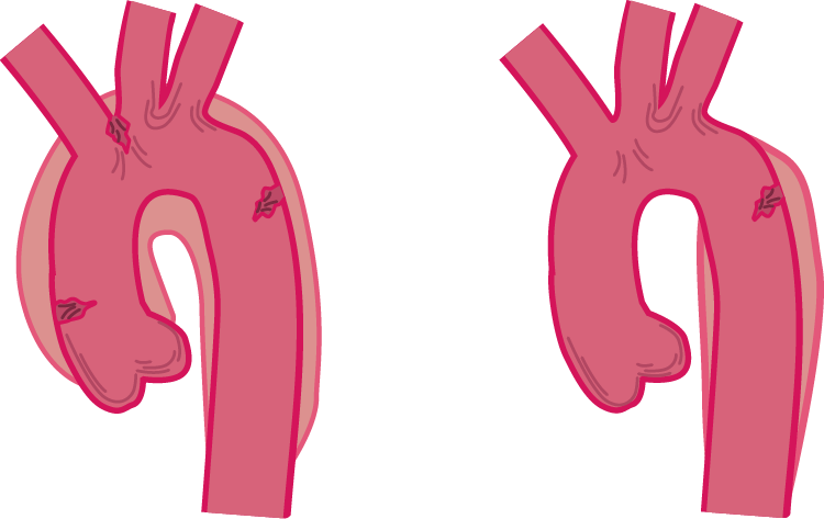大動脈の病気 大動脈は全身で最も大きい血管です 心臓から出た大動脈は少し上方に向かい、脳や両腕などに血管を分岐させながら、その後背部を胸部から腹部へと下方に降りて行き、臍のあたりで両足方向に向かう血管に分かれます。大動脈の代表的な病気は2つあります。 大動脈瘤 大動脈が大きくなる。 大動脈解離 大動脈の血管の壁が裂ける。 大動脈の病気の主な原因 動脈硬化が原因であることが多く、マルファン症候群のような先天的な組織の異常、感染性、外傷などが原因である場合もあります。 大動脈瘤 大動脈瘤とは大動脈の壁がこぶ状に膨らむ病気です。このこぶが破裂すると、大出血してショック状態となり、命の危機に直面し、一刻を争うことになります。主な原因は動脈硬化です。多くの場合無症状で、検診で初めて見つかることも多いのですが、危険性の高い大動脈瘤であると診断されたら、破裂する前であっても手術を検討するべきです。 大動脈瘤の主な治療方法 人工血管に置き換える人工血管置換術 ステントを挿入して破裂を防ぐステントグラフト内挿術 大動脈解離 大動脈解離とは、大動脈の内側に亀裂が入って血流の方向に裂ける病気です。大動脈解離が起こると、大動脈が膨れたり、破裂したり、血流障害が起こったりします。発症時、激しい胸や背中の痛みがおこり、解離が進むにつれ、腹、腰、脚など痛みが移動することが特徴的で、大変危険な状態であり早急な処置が必要です。原因には、動脈硬化、高血圧、高脂血症、遺伝性疾患などがあります。 大動脈解離の主な治療方法 解離した血管を人工血管に置き換える人工血管置換術 ステントグラフト内挿術